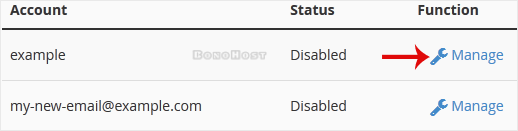 3. On the BoxTrapper's page, you see a list of your emails under the Account heading and the status of BoxTrapper under the Status heading. Choose Manage.