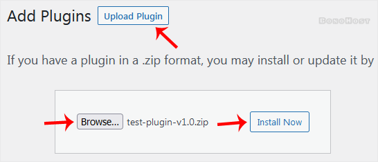 3. Click on Upload Plugin and then on Browse. Choose your plugin's zip file and click Install Now.